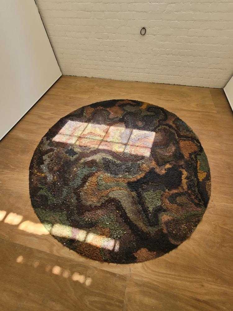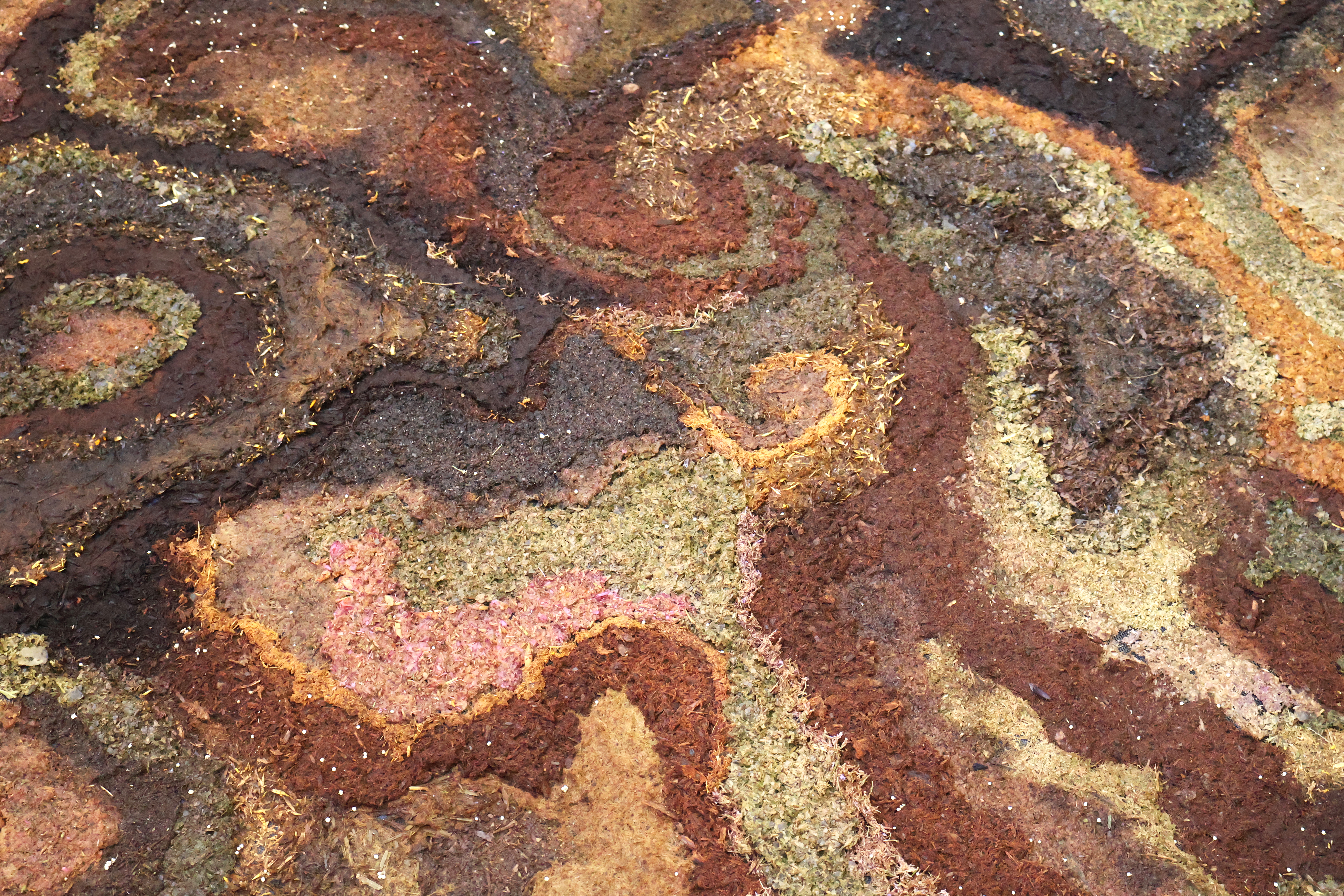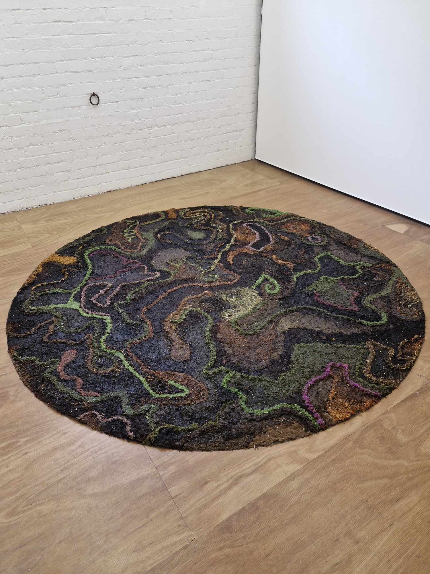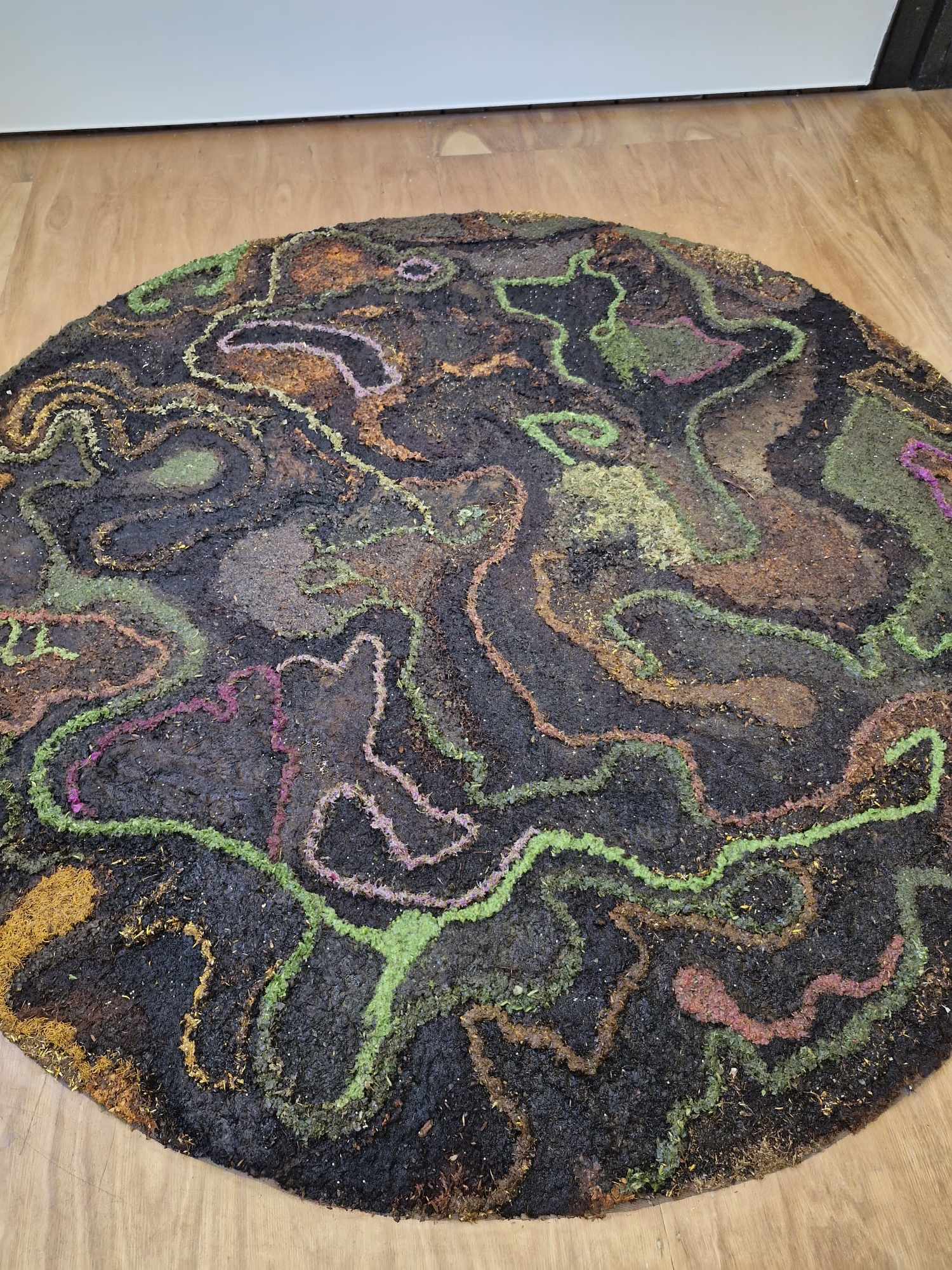 wayut (Woiwurrung) (eucalyptus stringybark), mallee (Woiwurrung) (eucalyptus cineria) leaves, biyal (Wadawurrung) (eucalyptus camaldulens) bark, karawun (Woiwurrung) (lomandra longifolia), tuggan tuggan (Zenadh Kes) (grevillea robusta), mangar (Noongar) (dianella revoluta), kum-ba-da (Woiwurrung) (soft tree fern), jacobaea maritima, indigofera australis, alyogyne huegelii, spyridium obcordatum, xerochrysum bracteatum, salvia, rhododendron, acanthus mollis, bergenia leaves, camellia japonica, camellia williamsii, butterfly bush, delphinium, verbena bonariensis on mesh and wire support. 92 cm diameter.