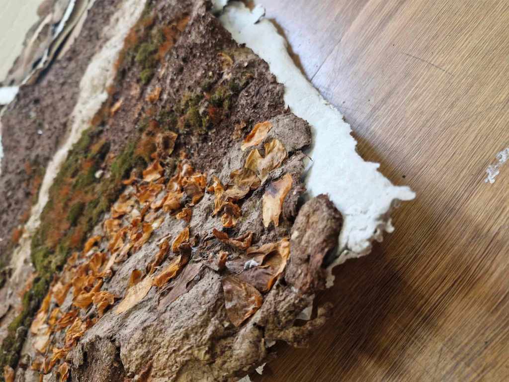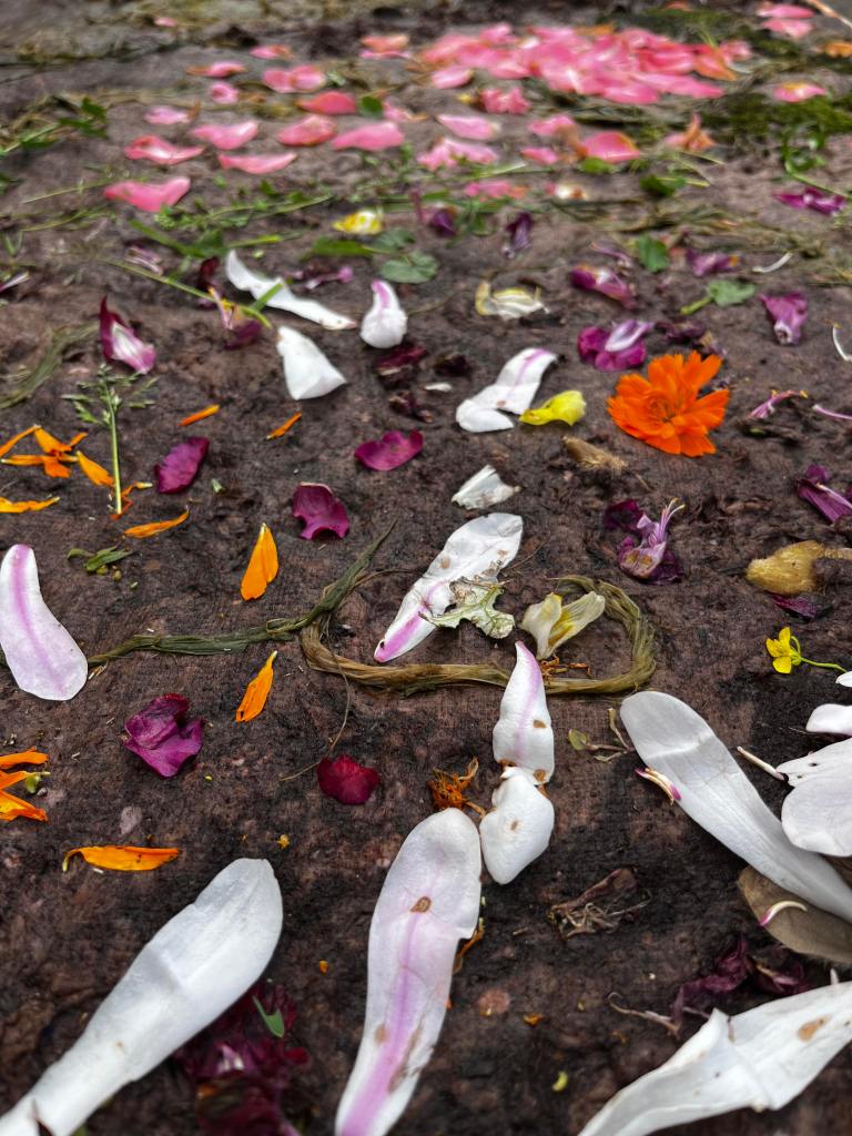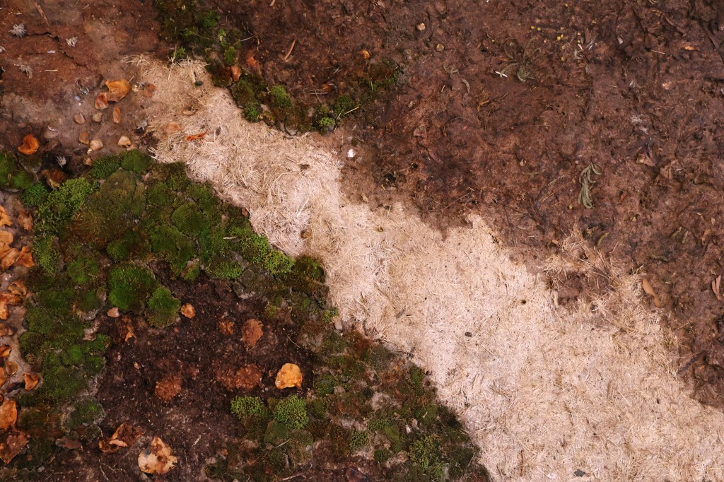 camellia japonica petals, karawan (Woiwurrung) (lomandra longifolia), wayut (Woiwurrung) (eucalyptus stringybark), autumn leaves, unidentified weeds, moss, lavender, marigolds, warrarak (Djadja wurrung) (acacia dealbata), ban (Gunaikurnai) (kangaroo grass), brachyscome multifida, rhodanthe anthemoides, xerochrysum bracteatum, dirt, hair, skin, oils, bacteria, merri creek water, recycled cardboard, on recycled paper and flour support. 70 x 112cm.