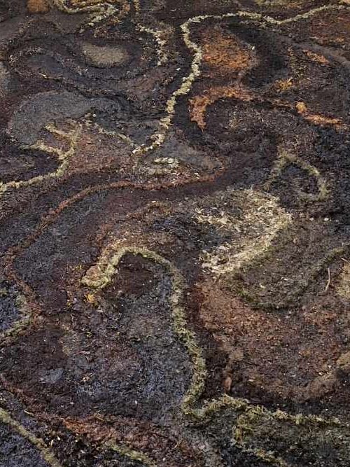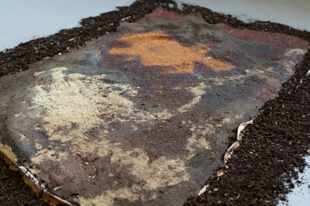wayut (Woiwurrung) (eucalyptus stringybark), mallee (Woiwurrung) (eucalyptus cineria) leaves, brachyscome multifida, conostylus, leek, potato skins, marigolds, onion skins, cornflower petals, pollen, spinach, mustard greens, lemon zest, compost, ban (kangaroo grass), buffalo grass, unidentified weeds, camellia japonica petals, autumn leaves, poppies, nasturtium, thyme, rosemary, snapdragons, calendulas, water, hair, skin, oils, bacteria, dirt, snail slime on recycled paper pulp and flour support. 70 x 112cm.