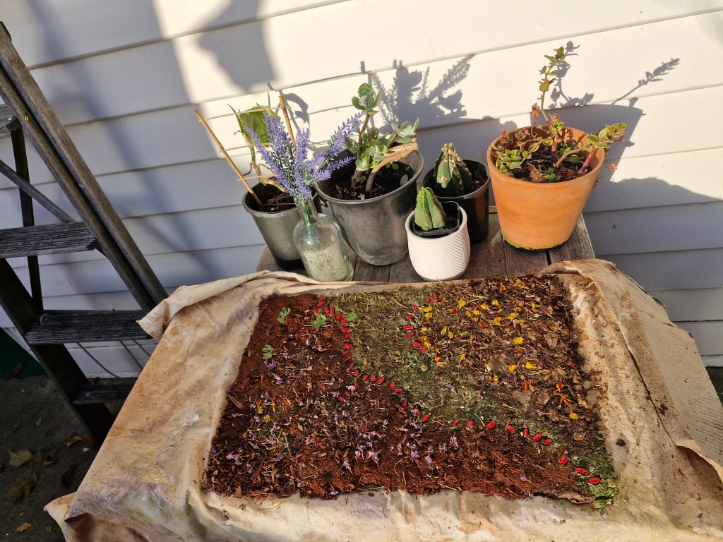 Rochelle Morris, ‘Tre(e)atise to Seed’, 2024, Wayut (Woiwurrung) eucalyptus stringybark, mallee (Woiwurrung)eucalyptus cineria, warrigal greens, autumn leaves, lillies, crassula dubia, arum italicum, verbena bonariensis, magnolia seeds, coriander, marigolds, pollen, soil, assorted seeds, water, timber frame, oak floorboards.
